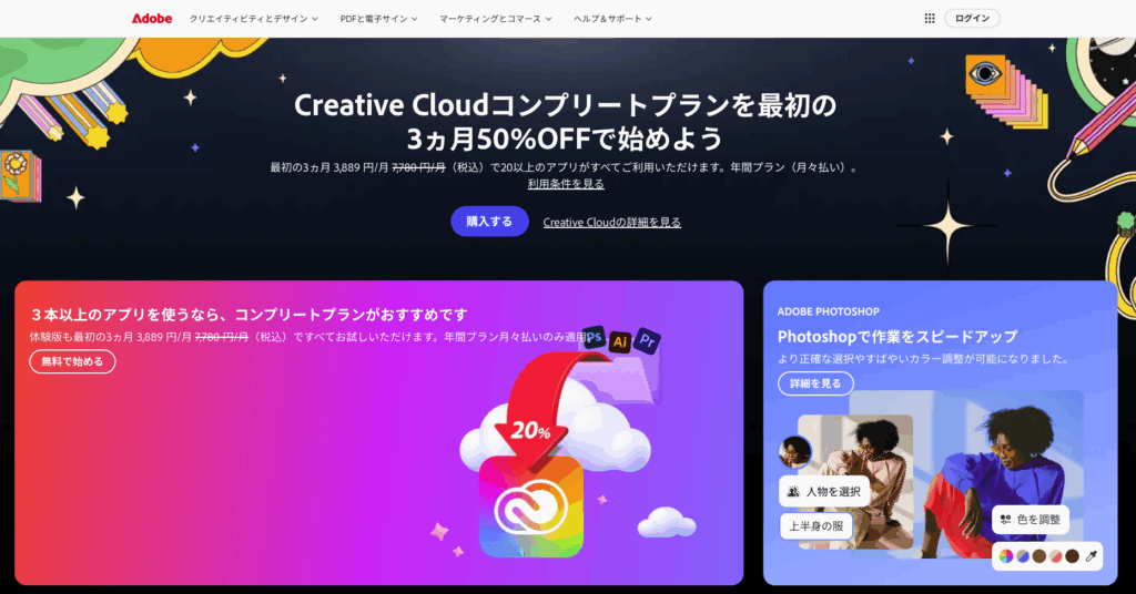 | Creative Cloudコンプリートプラン | 7,780円 | クリエイティブ制作に必要な 全アプリとサービスを利用可能。 (Photoshop、Illustrator、 Adobe Premiere Pro、 InDesign など) |